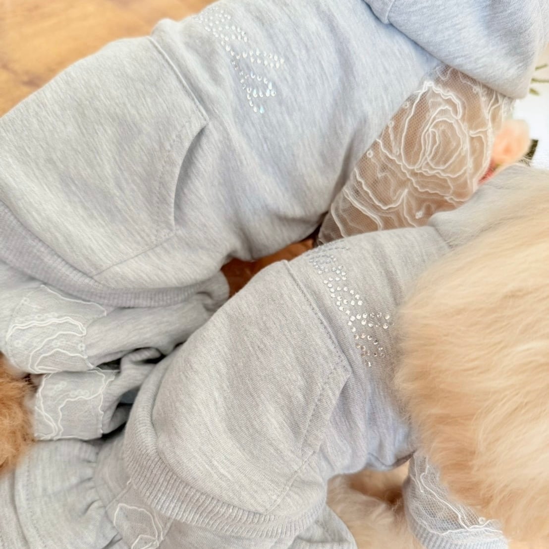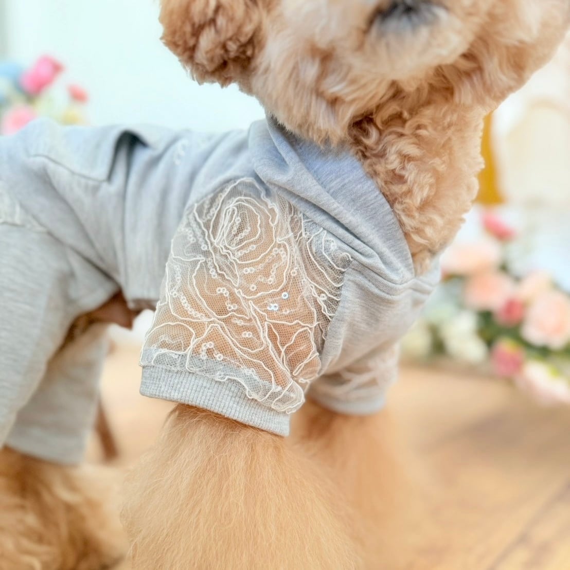 袖にはスパンコールを散りばめた繊細なレースを