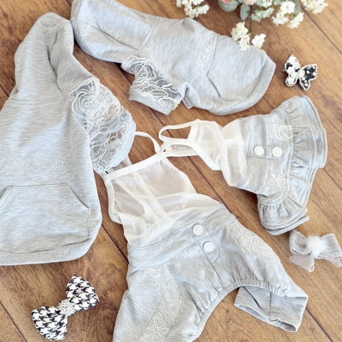 トップスの繊細なレース袖と対になるよう